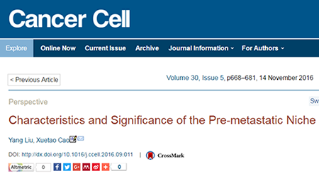 11月14日,曹雪涛院士与博士生刘洋在Cancer Cell(影响因子23.214)上发表了一篇题为“Characteristics and Significance of the Pre-metastatic Niche”的Perspective文章,评述了肿瘤转移前微环境的形成机制、组成特征及其促肿瘤转移的过程,尝试性地提出肿瘤转移前微环境的六大特征,并对该领域临床应用及未来研究方向进行了展望。