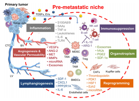 越来越的证据表明,原发性肿瘤能够通过在继发性器官(secondary organ)位置诱导一种支持性微环境(称为转移前微环境,pre-metastatic niche)的形成,促进转移发生。研究发现,转移前微环境能够通过多种不同的机制启动和建立。