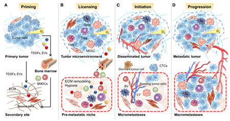 肿瘤转移是癌症相关死亡的主要原因。这表明,鉴定出肿瘤转移每一步中的关键分子和细胞组件,以及开发预防和控制肿瘤转移的策略尤为重要。循环肿瘤细胞(circulating tumor cells , CTCs)进入继发性器官或远处器官(secondary or distant organ)是转移中一个关键的步骤。CTCs遭遇的局部微环境对这一步骤具有极为重要的影响。它决定着是否肿瘤细胞的“殖民”(colonization)能够发生。