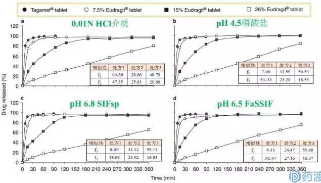 15% Eudragit(处方2)在四种介质中在120min处溶出才接近85%,而26% Eudragit(处方3)在360min处溶出才接近80%;