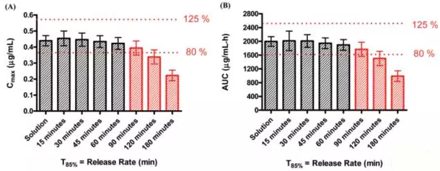 作者主要考察溶出达到85%时所需的溶出时间。上图的每个数据是基于24个虚拟试验的平均值而获得的(即假设受试者24例),其中,黑色框框表示预测具有生物等效性,红色则表示体内不等效。通过模拟可发现,药物体外溶出60min内达到85%,体内基本上是等效的;而在空腹时,胃排空时间一般为15-60min。