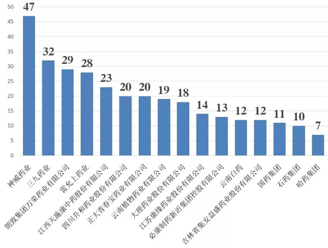 其中,中药注射剂批文数量最多的品种为鱼腥草注射液和香丹注射液,分别有113个产品获批生产。而神威药业、三九药业和万荣药业分别以47个、32个和29个批文占据中药注射剂批文数量TOP15企业前三甲。